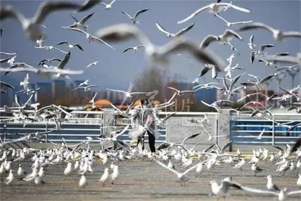 紅嘴鷗盤旋在低空,來銜游客拋在空中的面包,密密麻麻的,頗有遮天蔽日的勢頭。