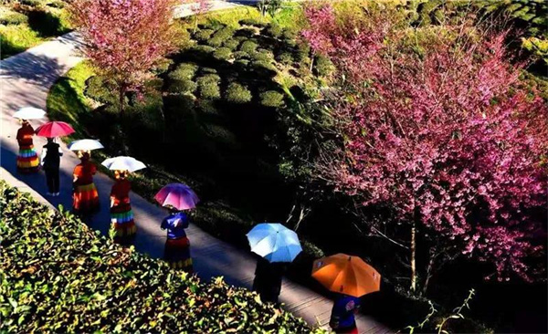 茶園、櫻花、遠山,宛若一幅色彩斑斕的油畫,滇中秘境最意外的春色悄然來臨。