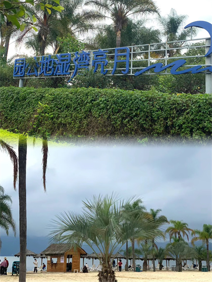 撫仙湖月亮灣濕地公園距離云南玉溪澄江縣城不到10公里,在撫仙湖北岸,悅椿渡假酒店對面。里面有各色花卉綠植,岸邊有白沙灘、茅草遮陽棚、白色沙灘椅,第一次去玩,還以為是在海邊。