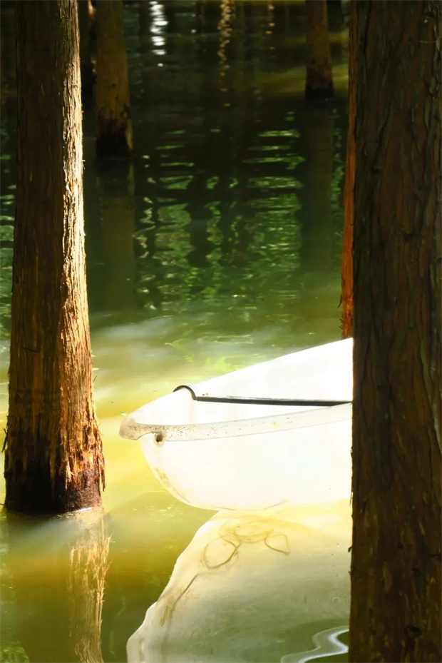 四點鐘的光影魔術:下午四點,陽光褪去正午的灼熱,斜斜穿過水杉枝葉的間隙,在船身、水面、發梢與衣角間灑下斑