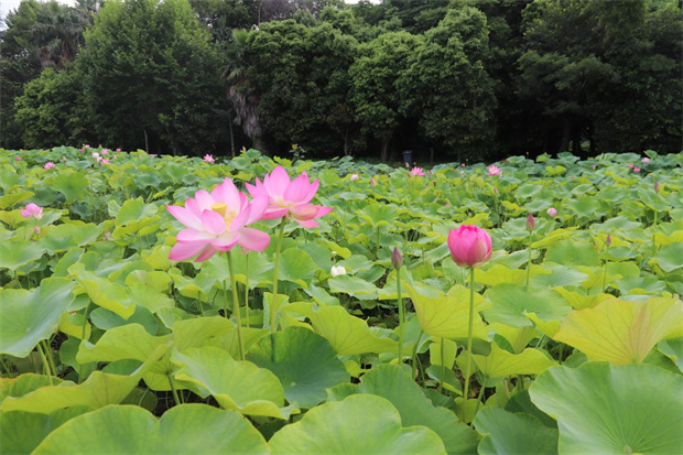到了正午,荷花全然綻放。粉的嬌艷,白的素凈,在綠葉襯托下格外醒目。陽光直射,照得花瓣幾乎透明,能看清纖細
