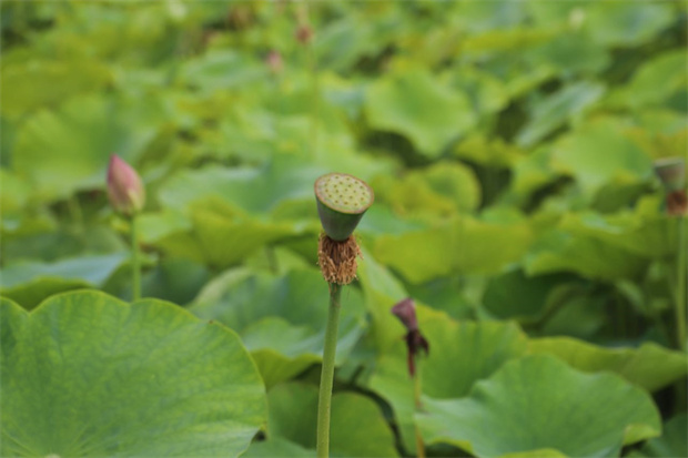 的脈絡(luò)。蜜蜂忙碌地在花心打轉(zhuǎn),沾了一身金黃的花粉。荷葉此時也完全舒展,邊緣微微上卷,像無數(shù)綠色的小船浮在