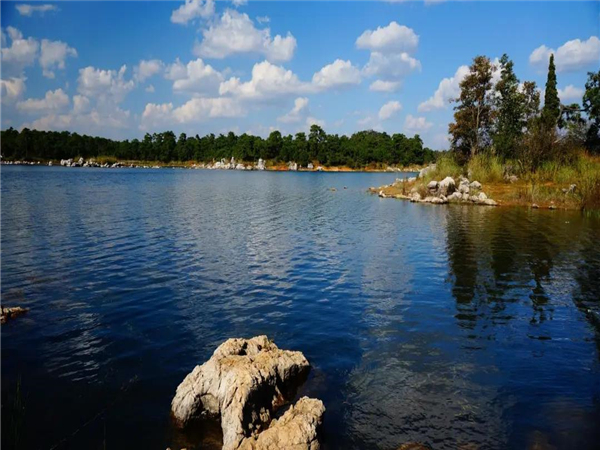 不同于石林風景區,石林長湖是真正山水相連的地方。這里湖水清澈平靜,魚兒眾多,空氣清新。岸邊青山綠樹倒映,讓人心曠神怡。