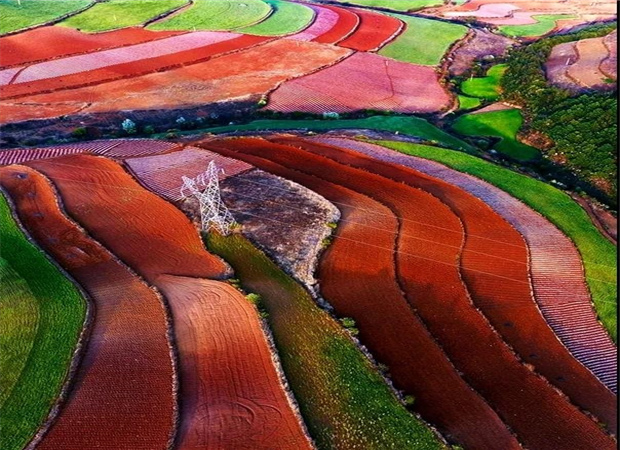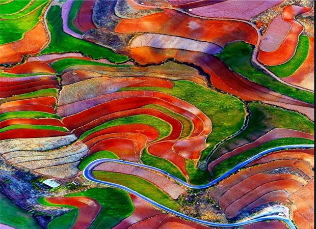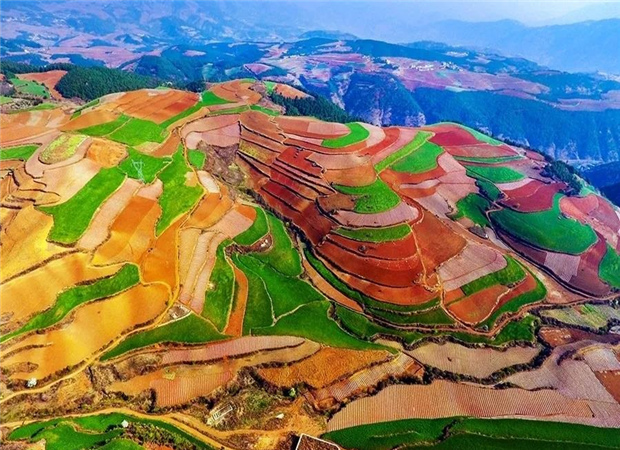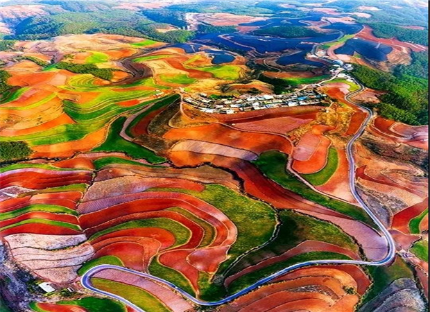 東川紅土地景區,位于云南省昆明市東川區紅土地鎮,獨特的紅色土壤成片地覆蓋在蜿蜒起伏的山地上,與綠色的莊稼、銀灰色的道路、白色的村莊等交相錯雜,形成了一幅幅色彩斑斕、絢麗多姿的巨幅“油畫”。