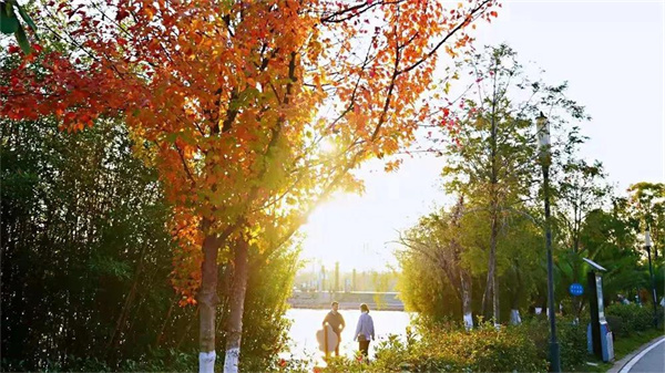 公園里盡是紅、黃、金色浸染,沙灘、湖泊、蘆葦相映,一景一物都如畫卷般美輪美奐。就連公園里的小路,在落葉的點綴下,美得都別有一番風韻。