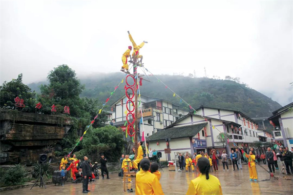 從昭通水富南下,山谷里綠意盎然,云霧繚繞中,隱約能看到數枝茶花盛開,驅逐了清晨的一絲寒意。往宜賓方向走,萬畝茶花林深處,是興隆高竿獅子舞的故鄉。