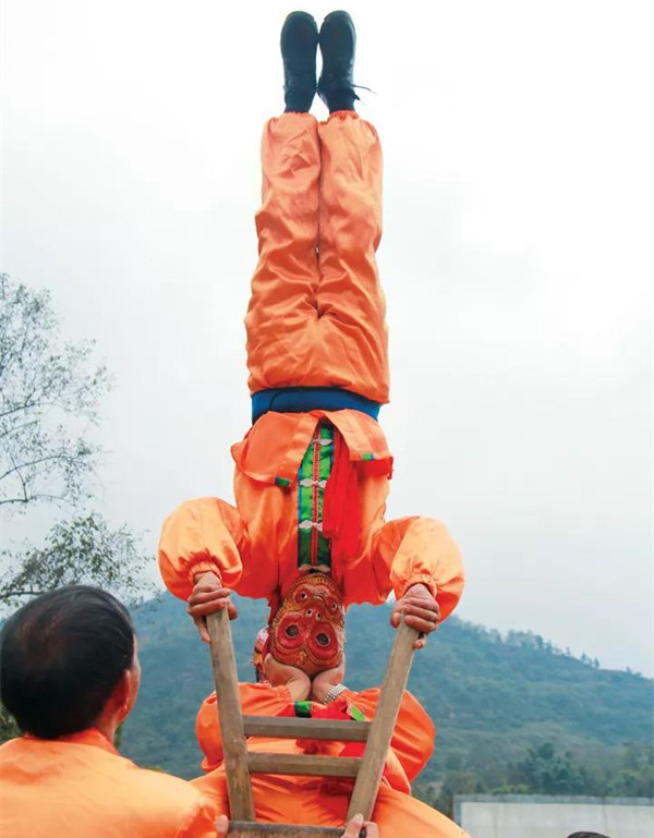 “鉆圈難就難在表演者需要連下5圈,最后雙手懸空倒掛在最后一圈,時間在1、2秒內,動作還要精準流暢?!敝窀晚敹吮硌菡叽怪本嚯x地面足有兩層樓高,可謂驚險刺激,觀者無不屏息凝神,拭目以待,高竿舞獅因此又被昭通作家譽為“針尖上的舞蹈”。