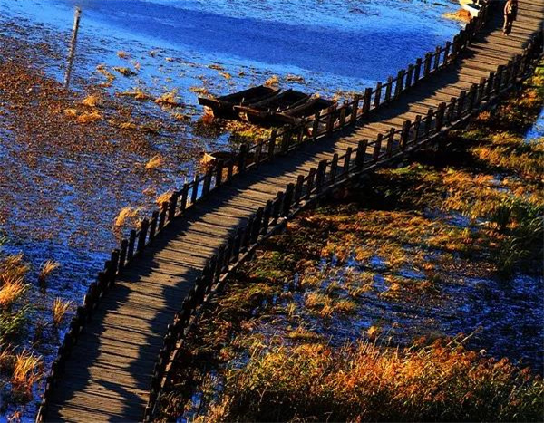 在草海上有一座古老的走婚橋,原是摩梭人約會的地方,也被稱為“天下第一鵲橋”。十月份,走婚橋兩邊的草甸也變黃了,秋風起,把草也吹彎了腰。