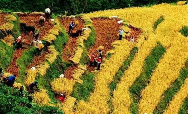 金秋的元陽梯田,由于海拔高低不同,一座山坡的梯田形態各異、顏色不一,黃色由淺變深。這個時候是收割的時節,梯田與勞作的人共同組成了一幅秋收圖。